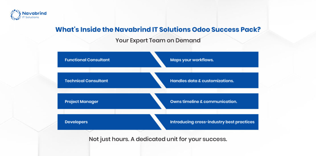 An Odoo Success Pack delivers a dedicated project team, not just a block of generic time. While structures may vary between Odoo SA and top Certified Partners like Navabrind IT Solutions, the main components of a framework remain consistent.