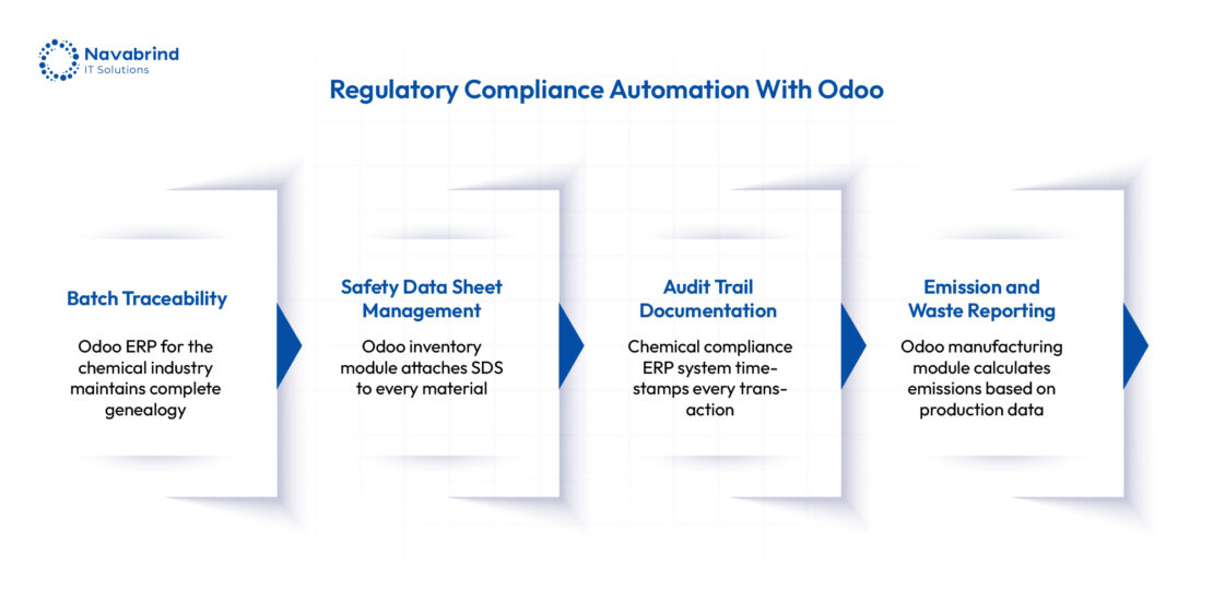 ERP software for chemical companies requires expensive customization to handle lot traceability and hazardous material controls. Odoo for chemical manufacturing iautomates compliance documentation, linking input, process step, and output to regulatory requirements.