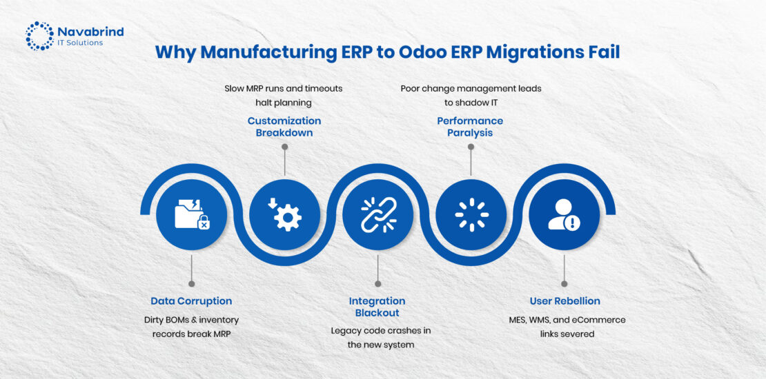 When production planners, floor managers, and finance teams are inadequately trained, they revert to old habits and rely on legacy systems such as spreadsheets. This user rejection is a pervasive issue that can render a technically sound migration operationally useless. These Odoo migration issues, data integrity, customization breakdown, and poor adoption collectively sabotage the return on investment and highlight why a strategic approach is non-negotiable.