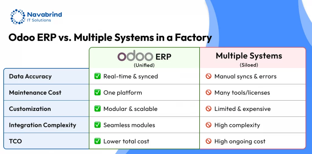 The Odoo ERP Cost Benefits of replacing disparate systems with a single solution are significant. When factories use multiple standalone software tools, they face high cumulative licensing fees, complex integrations, and ongoing maintenance costs. Odoo’s modular design means companies pay for only what they need, and its seamless integration across modules removes the hidden costs associated with data silos and incompatible systems. This leads to substantial ERP savings for manufacturing and positions Odoo as a cost-effective ERP for factories seeking to reduce overhead while enhancing operational efficiency.