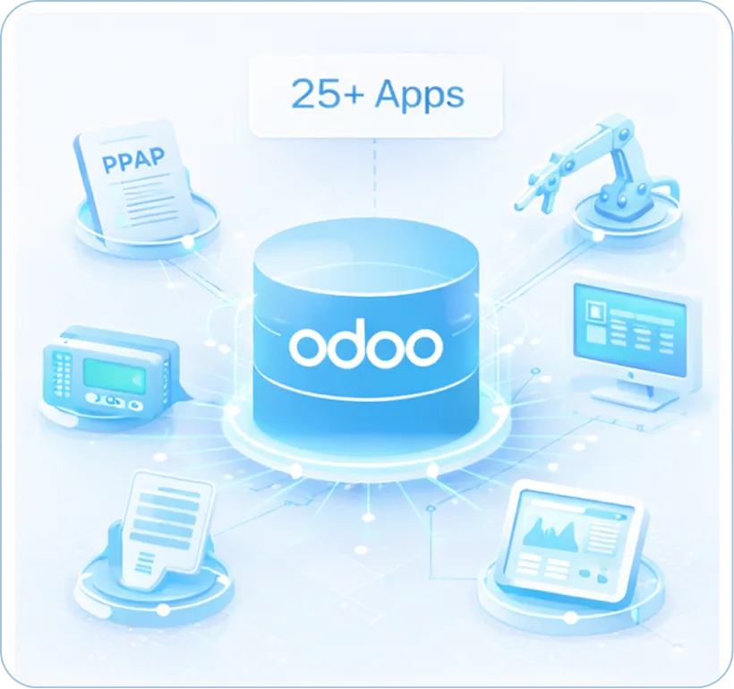 Connect Odoo to 25+ manufacturing apps, including PPAP, PLCs, SCADA, MES systems, and more.