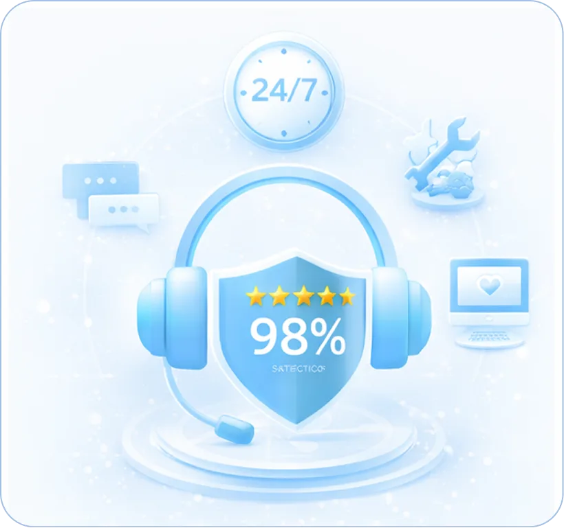 24/7 availability across time zones, rapid response time, 98% user satisfaction among 500+ clients.